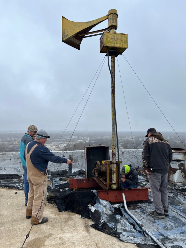 One of the fun aspects of the crane lift was the fact that it provided a great opportunity to bring down the heavy blower motor for the Civil Defense Siren. Two summers ago, we documented and removed most of the 1956 siren components so that they could be refurbished. The blower motor proved to be too heavy to safely handle in getting it down manually with ropes. The crane worked perfectly. When fully refurbished, the siren will find a new home in a community needing an emergency warning system upgrade. The young man from Jacksonville doing the work is impressive.