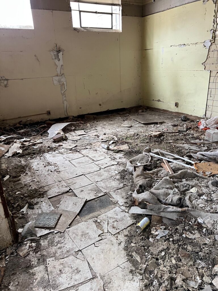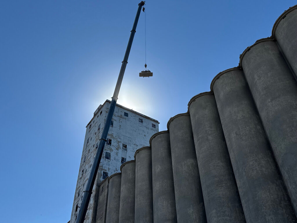 Last Friday morning (10/10) the crews from Select Demo used a 250′ crane to lift equipment and supplies to the top of the 224′ tall Headhouse. Removal of the silver coating on the top half of the Headhouse is the last phase of cleanup at the site. All of the buildings were cleared of asbestos by late summer. The silo cleanup was completed just this past week.