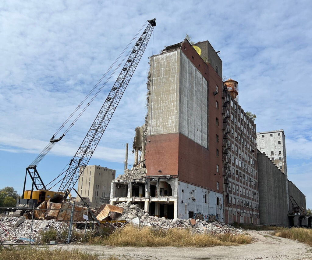 The viewing area near 16th St. and Phillips Ave. continues to have a lot of activity. The big crane and wrecking ball have been working to bring down the 160′ tall Turbo and Bulk Storage buildings this week. They were constructed in the early 1960’s at the south end of the AB-Mill. Ground crews with trackhoes are sorting materials from the Grocery Mix building demolition. It is fun to see the heavy equipment at work and progress being made. The best active viewing times are from 8:00 to 3:00pm Monday thru Friday.