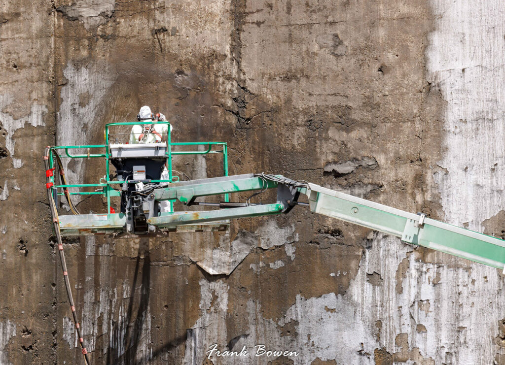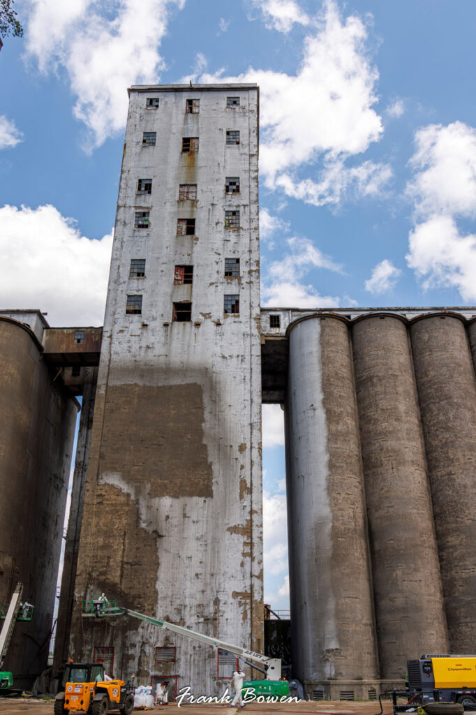 The largest part of the cleanup at this stage of the project involves the removal of the silver paint coating on the silos and headhouse. It has approximately 5% of asbestos content and has been problematic for years. Once this 290,000 sq. ft. surface coating is removed, we can demolish these structures and recycle the estimated 70,000 tons of concrete.